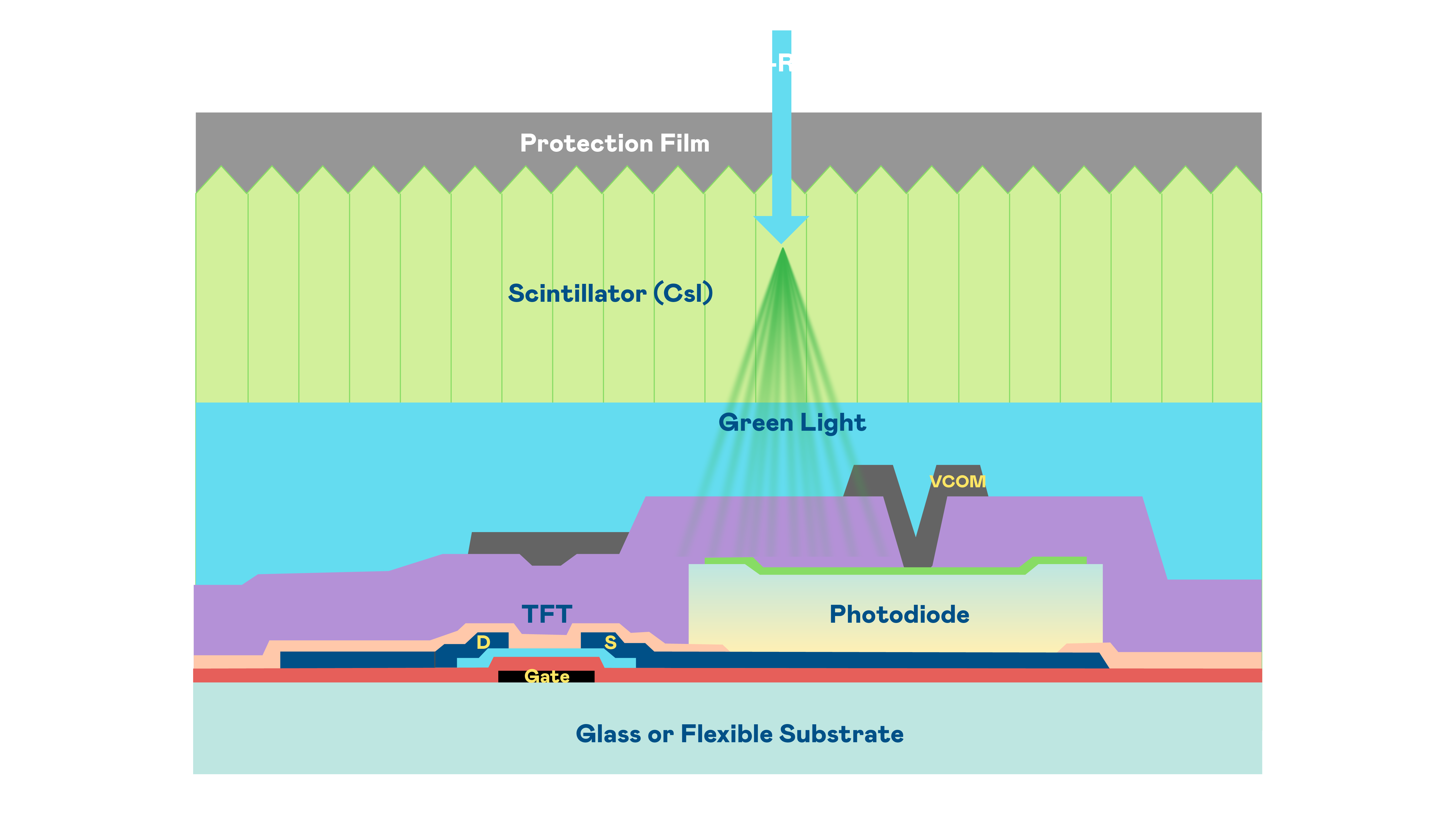 太阳成集团tyc151cc的X光影像感测阵列使用薄膜电晶体 (TFT) 作为每个像素的读取开关,搭配光电二极体(Photodiode)的光电转换元件,用以感测X光影像讯号。